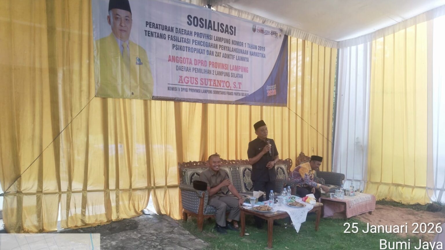 Anggota DPRD Provinsi Lampung, Agus Sutanto, melaksanakan Sosialisasi Peraturan Daerah (Sosper) Provinsi Lampung Nomor 1 Tahun 2019 tentang Fasilitasi Pencegahan Penyalahgunaan Narkotika, Psikotropika, dan Zat Adiktif Lainnya, pada 25 Januari 2026.