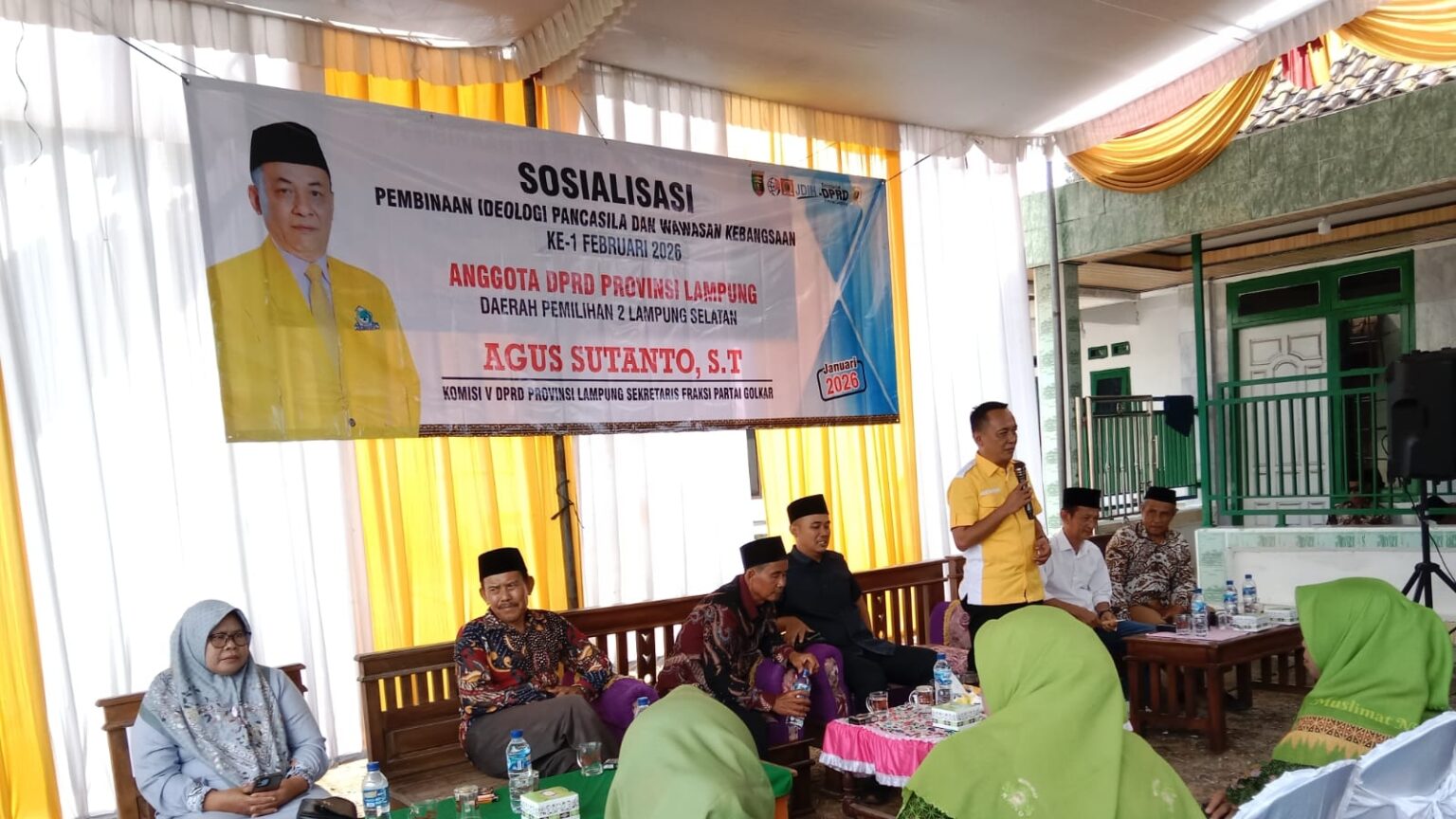 Anggota DPRD Provinsi Lampung dari Fraksi Partai Golkar, Agus Sutanto, menggelar Sosialisasi Pembinaan Ideologi Pancasila (PIP) dan Wawasan Kebangsaan di Desa Way Gelam, Kecamatan Candipuro, Kabupaten Lampung Selatan, Minggu (8/2/2026).