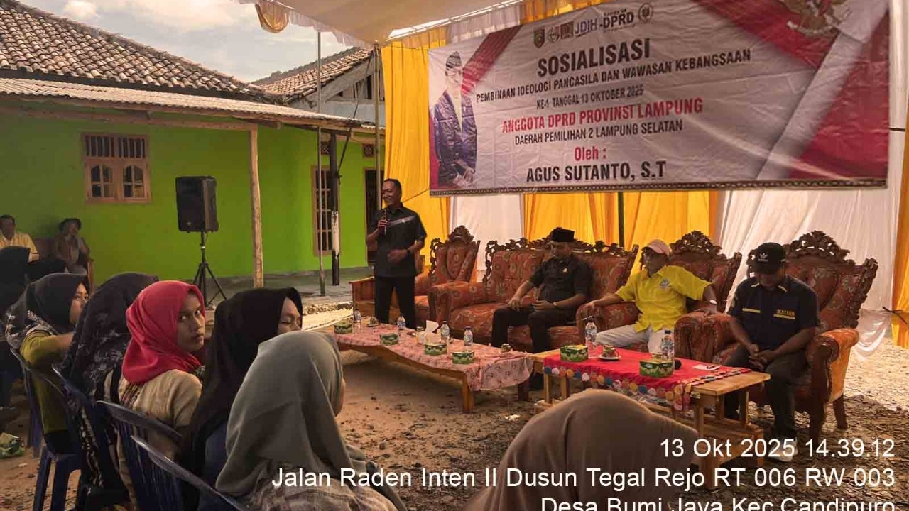 Anggota DPRD Provinsi Lampung dari daerah pemilihan (dapil) Lampung Selatan, Agus Sutanto, menggelar kegiatan rutin Sosialisasi Pembinaan Ideologi Pancasila dan Wawasan Kebangsaan (Wasbang) di Desa Bumi Kaya, Kecamatan Candipuro, Kabupaten Lampung Selatan, Minggu (13/10/2025).