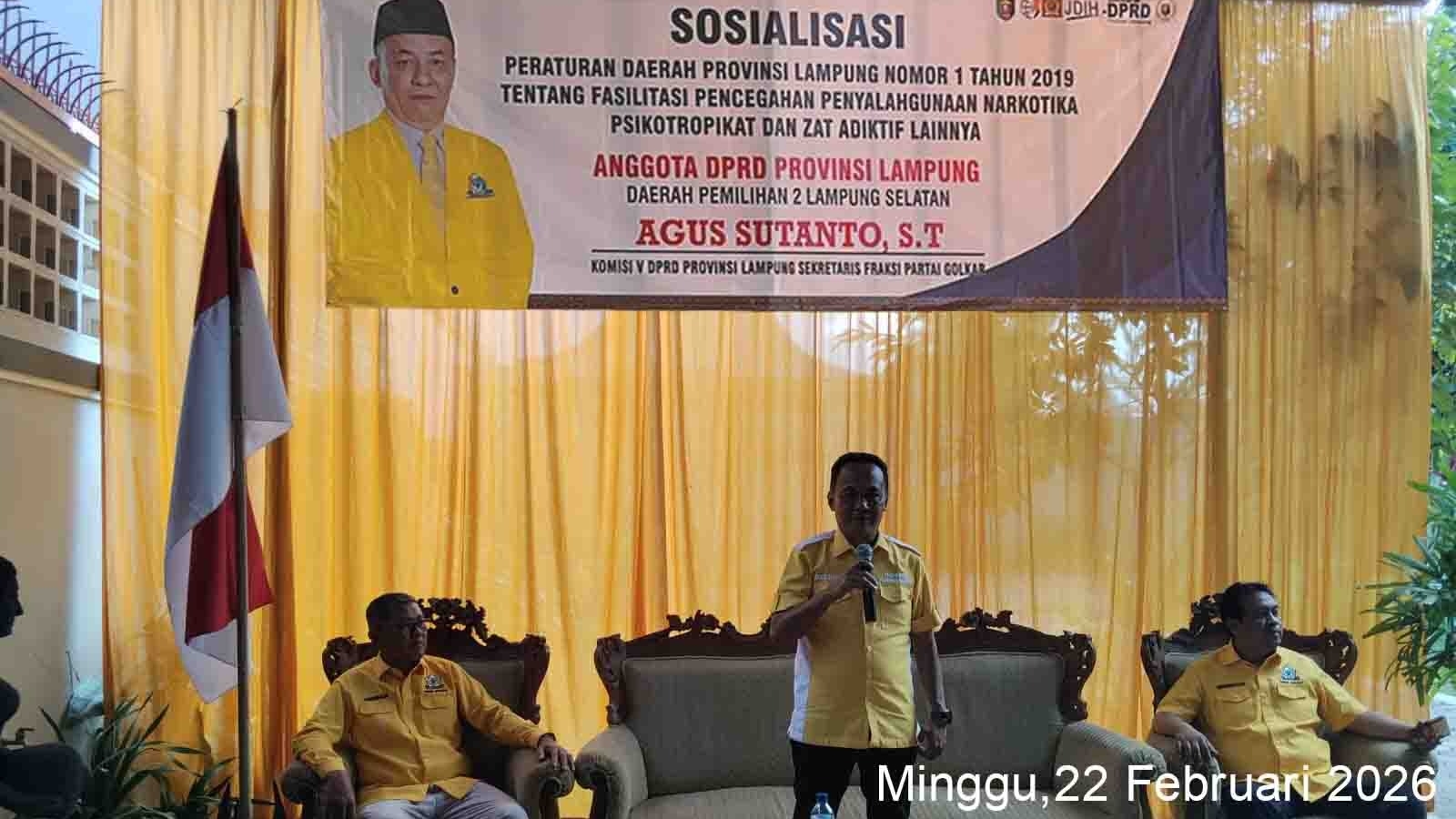 Anggota DPRD Provinsi Lampung dari Daerah Pemilihan Lampung Selatan, Agus Sutanto, melaksanakan kegiatan Sosialisasi Peraturan Daerah (Sosper) di Dusun 1, Desa Sido Asri, Kecamatan Candipuro, Kabupaten Lampung Selatan, Minggu (22/02/2026).