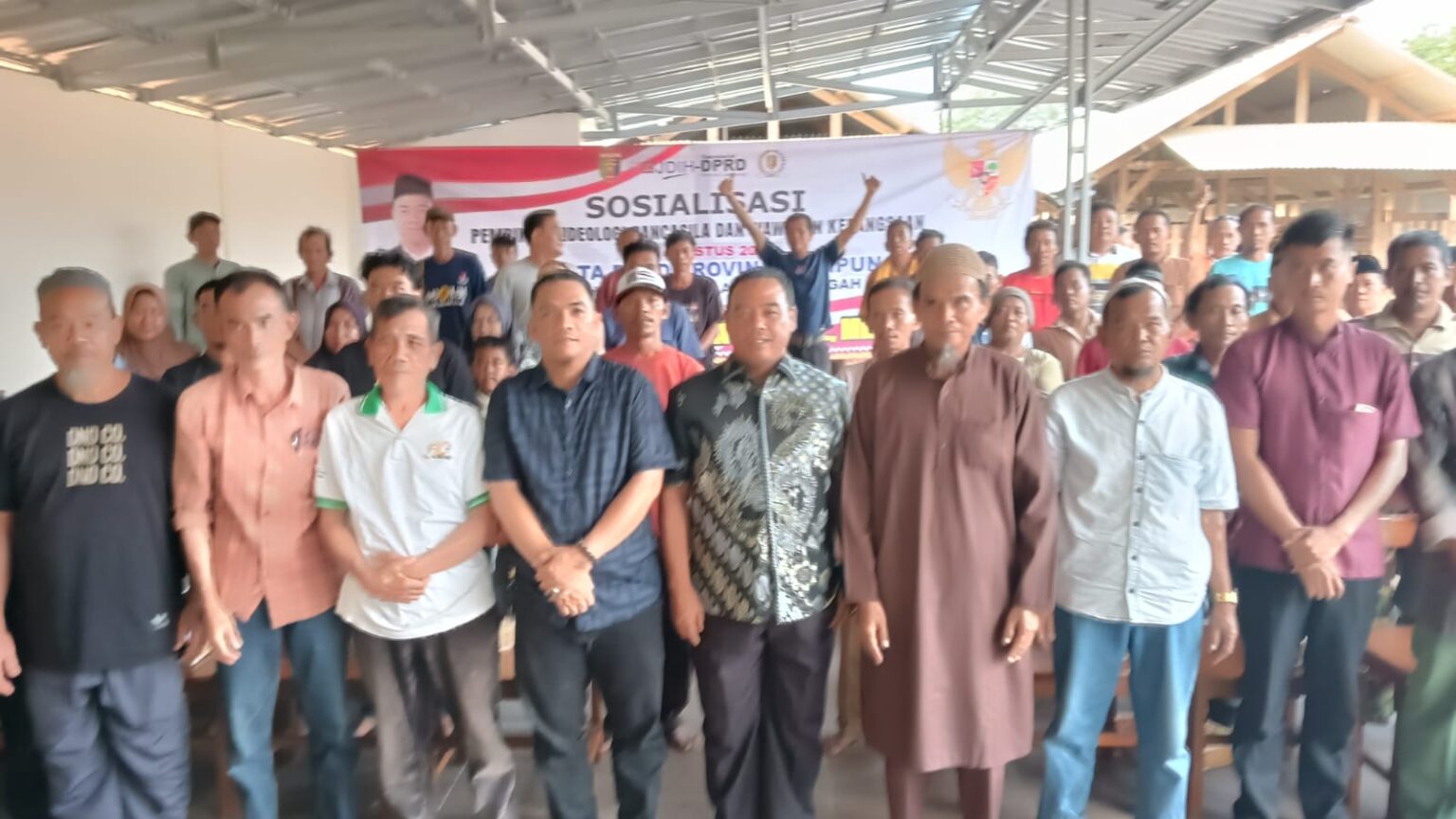 Balai Desa Gunung Sugih, Lampung Tengah, tampak ramai pada Minggu pagi, 23 Agustus 2025. Ibu-ibu PKK dan Kelompok Wanita Tani duduk berjejer, tokoh masyarakat, pemuda, dan aparatur desa ikut hadir untuk mengikuti Sosialisasi Pembinaan Ideologi Pancasila dan Wawasan Kebangsaan yang digagas anggota DPRD Provinsi Lampung, Abdullah Surajaya.