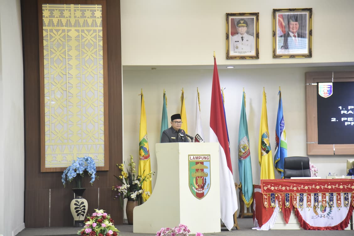 Juru Bicara Fraksi Gerindra, Fauzi Heri, menyampaikan pandangan fraksi dalam rapat paripurna pembahasan tiga Rancangan Peraturan Daerah (Raperda) prakarsa Pemerintah Provinsi Lampung, Kamis (9/10/2025).