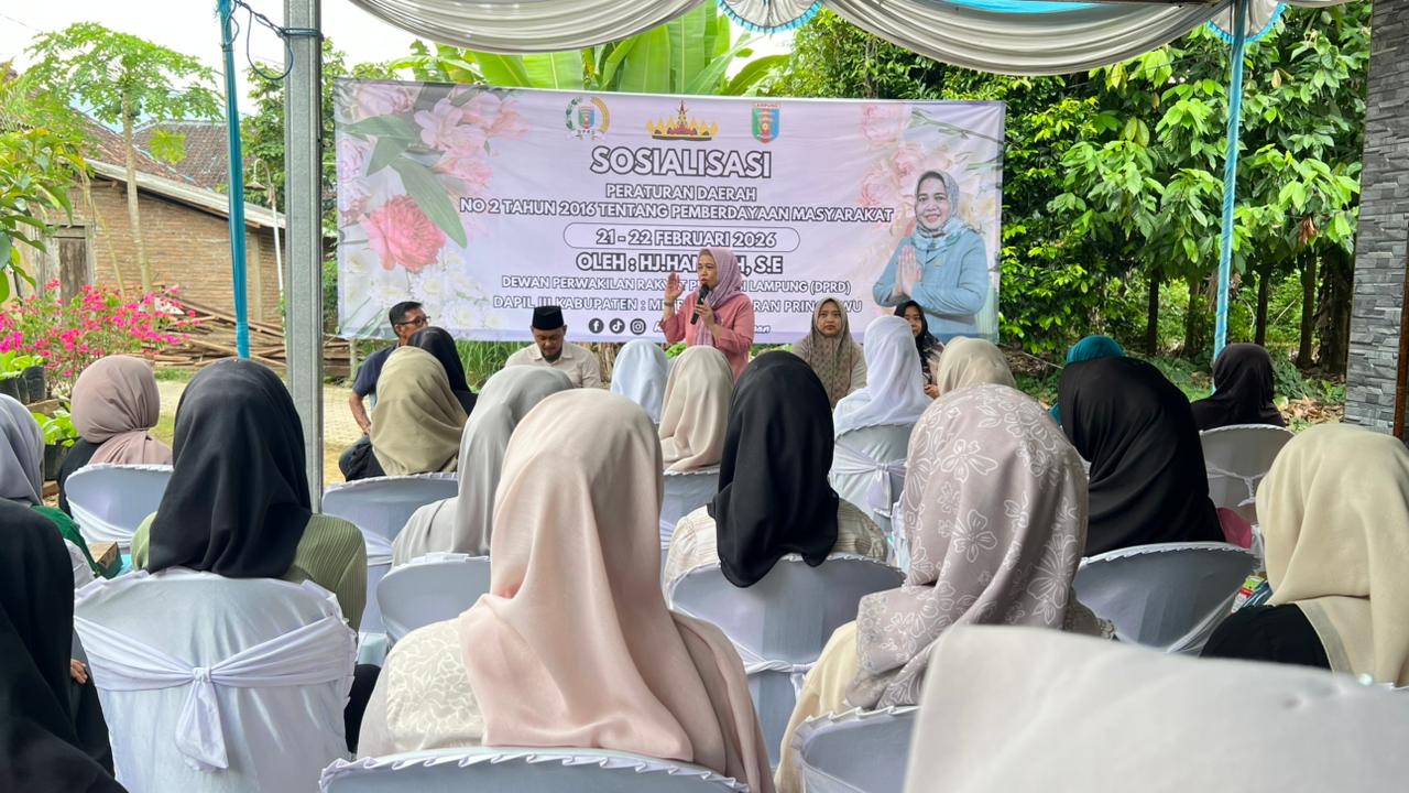 Anggota DPRD Provinsi Lampung, Hanifah, menggelar sosialisasi Peraturan Daerah (Perda) di Desa Trimulyo, Kecamatan Padang Cermin, Kabupaten Lampung Selatan, dengan fokus mendorong pemanfaatan program desa untuk meningkatkan kesejahteraan masyarakat.
