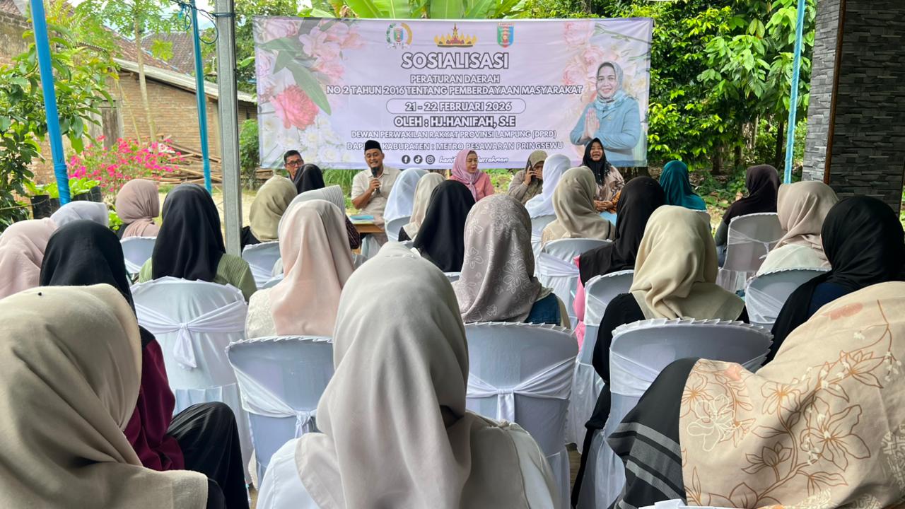 Anggota DPRD Provinsi Lampung, Hanifah, menggelar sosialisasi Peraturan Daerah (Perda) di Desa Trimulyo, Kecamatan Padang Cermin, Kabupaten Lampung Selatan. Kegiatan ini menjadi bagian dari upaya memperkuat tata kelola pemerintahan desa yang partisipatif dan transparan.
