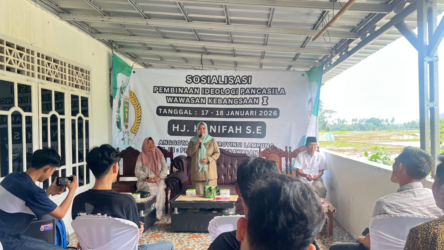 Anggota DPRD Provinsi Lampung, Hanifah, menggelar Sosialisasi Pembinaan Ideologi Pancasila dan Wawasan Kebangsaan (PIP-WK) perdana tahun 2026 di Desa Padang Cermin, Kecamatan Padang Cermin, Kabupaten Pesawaran, Minggu (18/1/2026).