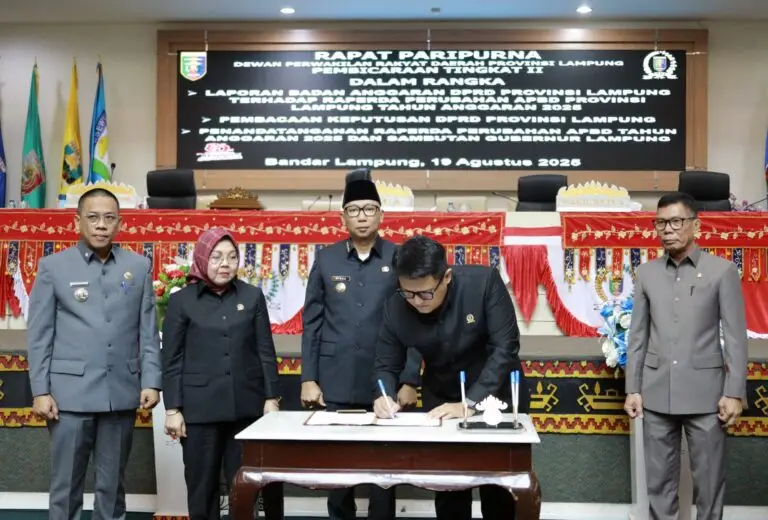 Kesepakatan itu ditandai dengan penandatanganan bersama antara Gubernur Lampung Rahmat Mirzani Djausal dan Ketua DPRD Lampung Ahmad Giri Akbar dalam rapat paripurna di ruang sidang DPRD, Selasa (19/8/2025).