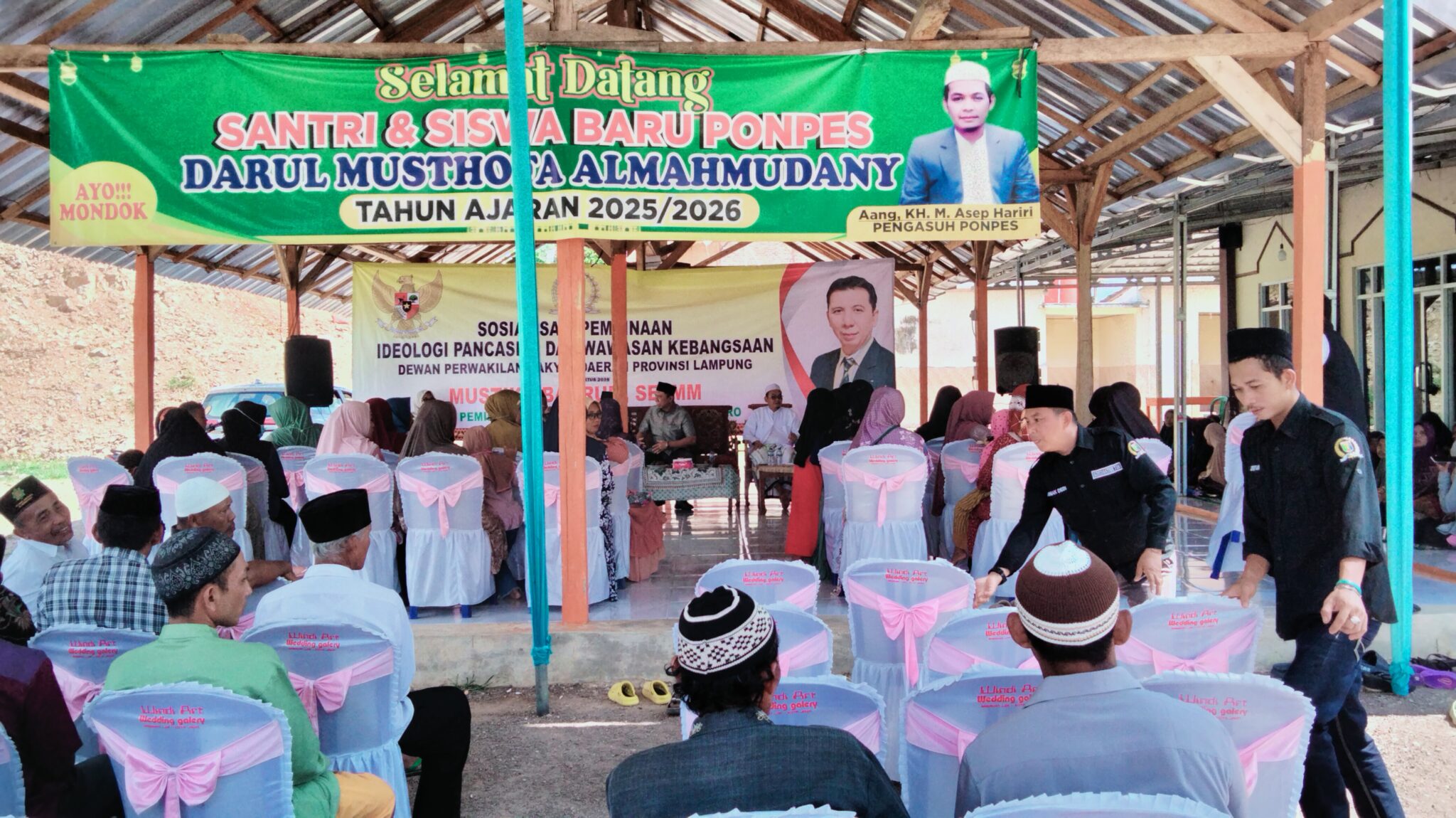 Pondok Pesantren Darul Mustofa Almahmudany, Desa Gunung Sari, Kabupaten Pesawaran, ramai oleh santri dan santriwati pada Sabtu, 23 Agustus 2025. Mereka mengikuti Sosialisasi Pembinaan Ideologi Pancasila dan Wawasan Kebangsaan yang digelar anggota DPRD Provinsi Lampung, Mustika Bahrum.