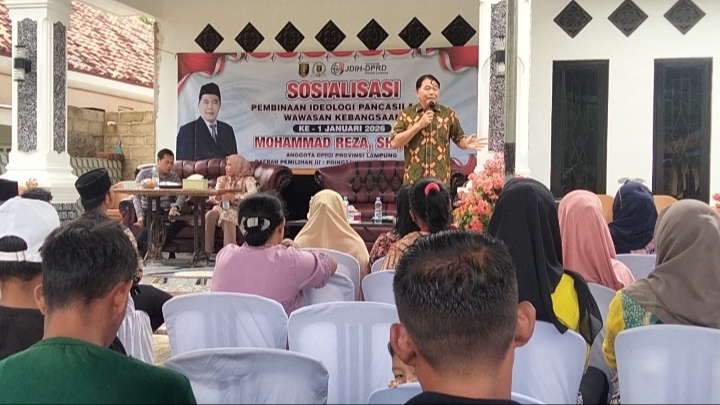 Anggota Komisi I DPRD Provinsi Lampung, Mohammad Reza Berawi, menggelar Sosialisasi Pembinaan Ideologi Pancasila dan Wawasan Kebangsaan (PIP-WK) ke-1 Tahun 2026 di Desa Poncokresno, Kecamatan Negeri Katon, Kabupaten Pesawaran, Sabtu (17/1/2026).