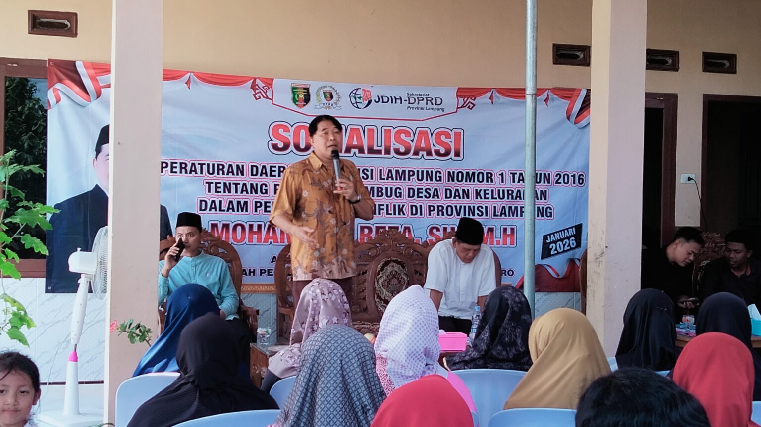 Anggota DPRD Provinsi Lampung, Mohammad Reza Berawi, kembali menggelar Sosialisasi Peraturan Daerah (Perda) sebagai upaya menyebarluaskan regulasi kepada masyarakat. Kali ini, ia mengangkat Perda Provinsi Lampung Nomor 1 Tahun 2016 tentang Pedoman Rembug Desa dan Kelurahan dalam Pencegahan Konflik.