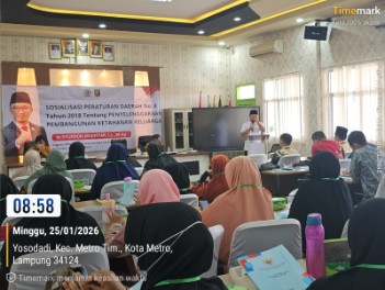 Anggota DPRD Provinsi Lampung Dapil III (Metro, Pesawaran, Pringsewu), M. Syukron Muchtar, memilih pendekatan berbeda dalam menyosialisasikan Perda Nomor 4 Tahun 2018 tentang Penyelenggaraan Pembangunan Ketahanan Keluarga. Ia menyasar para guru ngaji dalam kegiatan yang digelar di Aula SMK Muhammadiyah Metro Timur, Sabtu (24/1).
